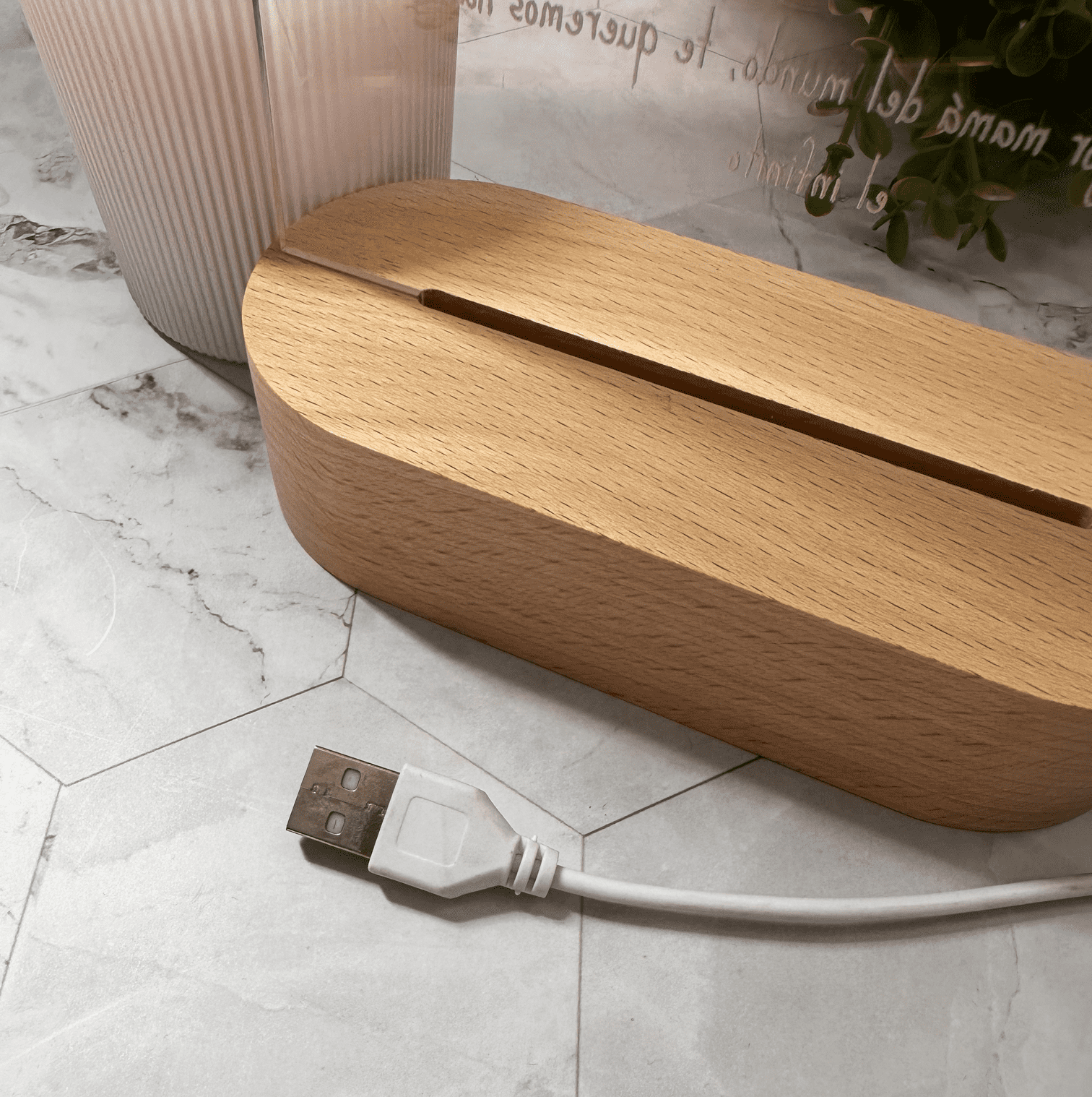 Descripción producto: placa metacrilato 140 x 210 mm y 4 mm de grosor, base de madera con luz cálida 145 x 60 mm.
