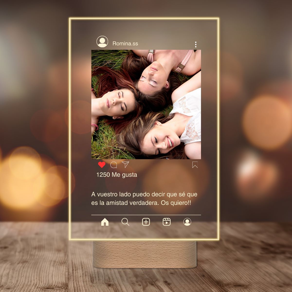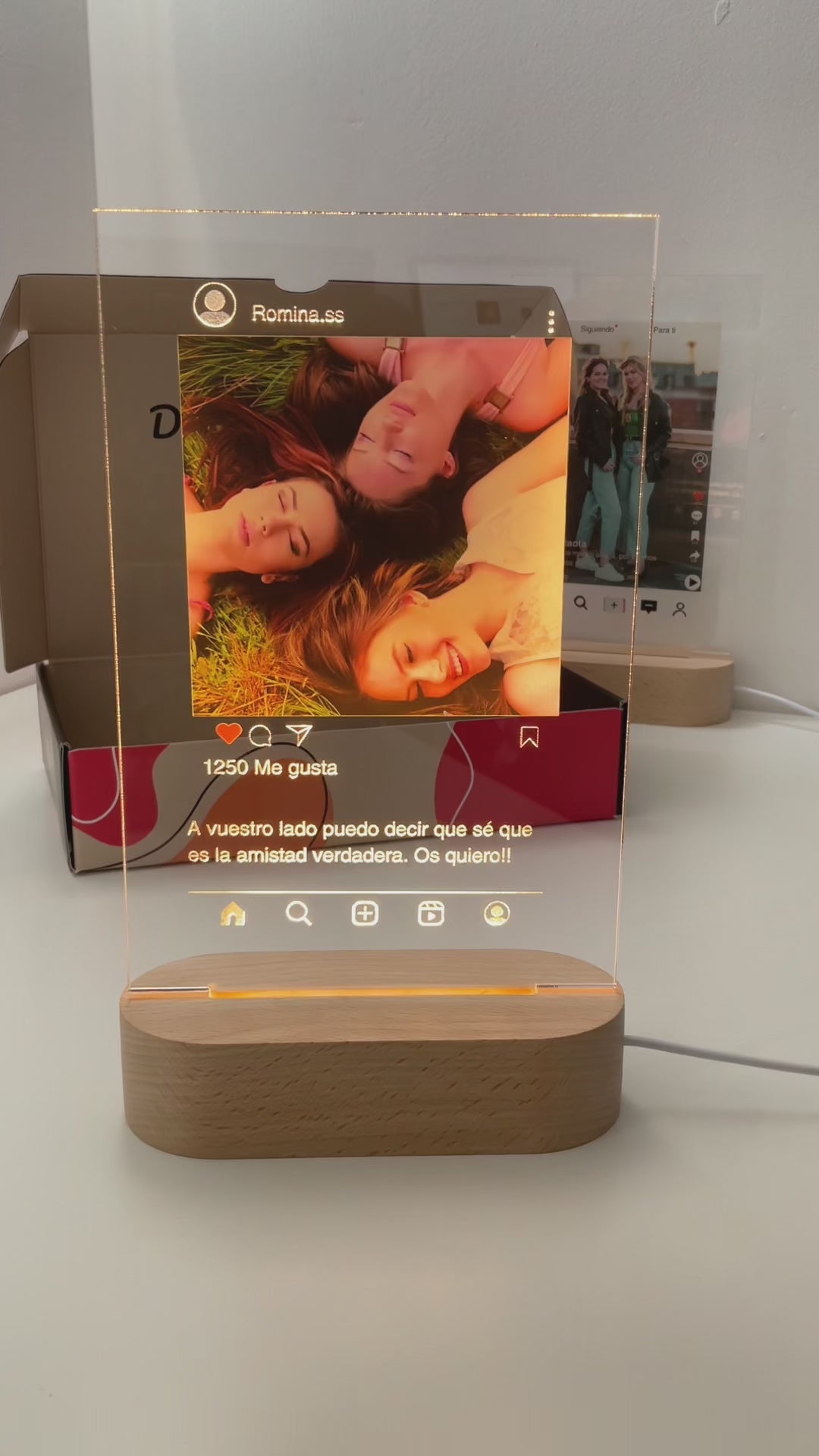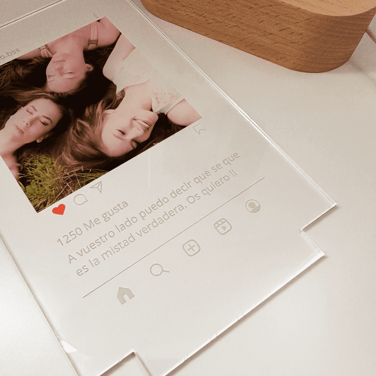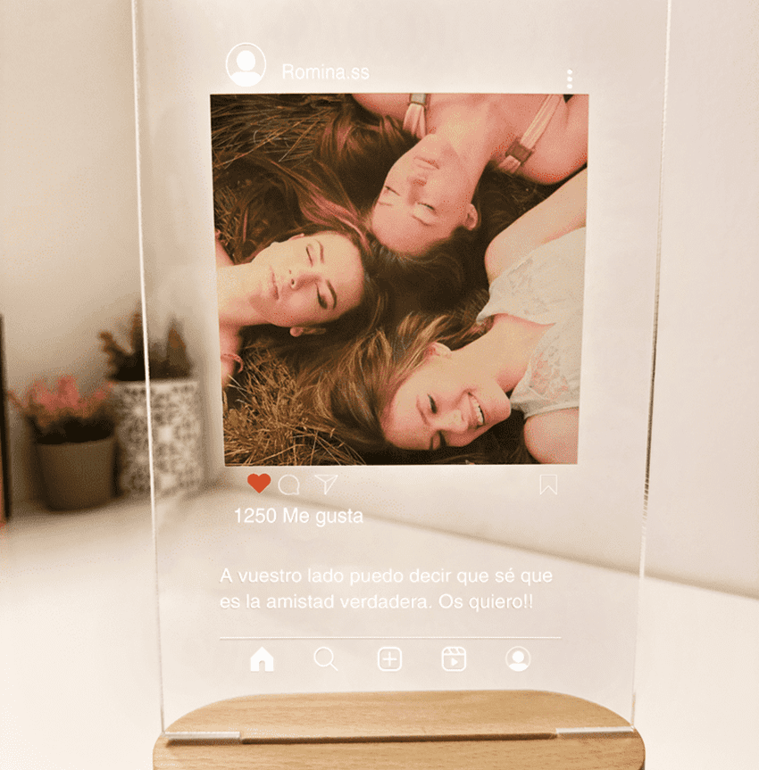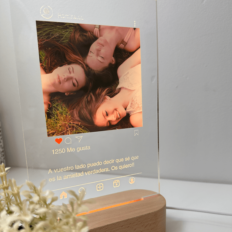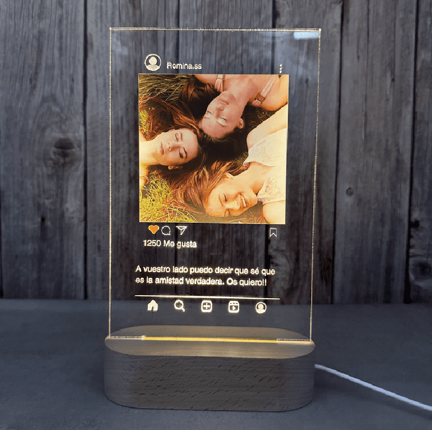 Nuestra lámpara personalizada Instagram es un regalo ideal para los amantes de esta red social. Con ella puedes regalar tu foto favorita, especial para esa persona, con un estilo de publicación de Instagram. También puedes incluir una dedicatoria impresa que se iluminará con la base de madera con luz cálida.